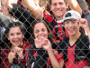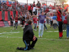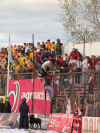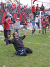 Auf den Rängen, ja, da war was los. Erst zwei Stunden lang Vorfreude, wobei der ein oder andere den mitgebrachten Bengalo nicht mehr warten lassen wollte, dann die Emotionsejakulation beim Intro und dann Fingernägel kauen und zittern und fluchen. Und dann die große Party. Bereits vor Abpfiff hielten es einige nicht mehr aus und wollten den Platz stürmen. Die Polizei blieb ruhig, forderte gelassen aber bestimmt die Zaunkletterer auf, wieder auf die Plätze zurückzukehren, man bedenke doch die Folgen. Die Zaunkletterer überlegten kurz, sahen es ein und warteten noch die paar Minuten, bis der Schiri abpfiff. Jetzt musste wiederum die Polizei kurz überlegen, wie man zu reagieren habe (man konnte deutlich die Fragen in den Gesichtern ablesen), schließlich waren Gästespieler und Schiri noch auf dem Feld. Damit niemand beim Klettern abstürzt oder die Masse ungeduldig wird oder vielleicht einfach aus Zufall wurde ein Tor geöffnet, viele Heimfans strömten euphorisiert, mit Tränen in den Augen auf den Platz, entkleideten die eigenen Spieler bis auf die Unterhosen und feierten um ein Tor herum. Diesen Moment nutzte die Polizei, um Gästespieler und Schirigespann an der Meute vorbeizuschmuggeln. Als diese das mitbekam ging sie auf die Gästespieler los - und applaudierte ihnen. Dann wurde weiter gefeiert. Nach etwas mehr als einer Stunde war das Stadion leer und die Feierlichkeiten gingen in der Innenstadt weiter.