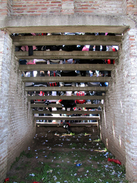 Die Schlangen davor waren bereits 2 Stunden vor Anpfiff endlos lang und eine Stunde vor Beginn der Partie passte kein Choripan mehr in den Magen gedrängter Zuschauer, da der Nachbar dagegendrückte. Die Stadionwurst ist hier durchaus zu empfehlen, allergings gab's die Dinger nur in der Basisversion - ohne Salsa, ohne alles.