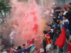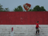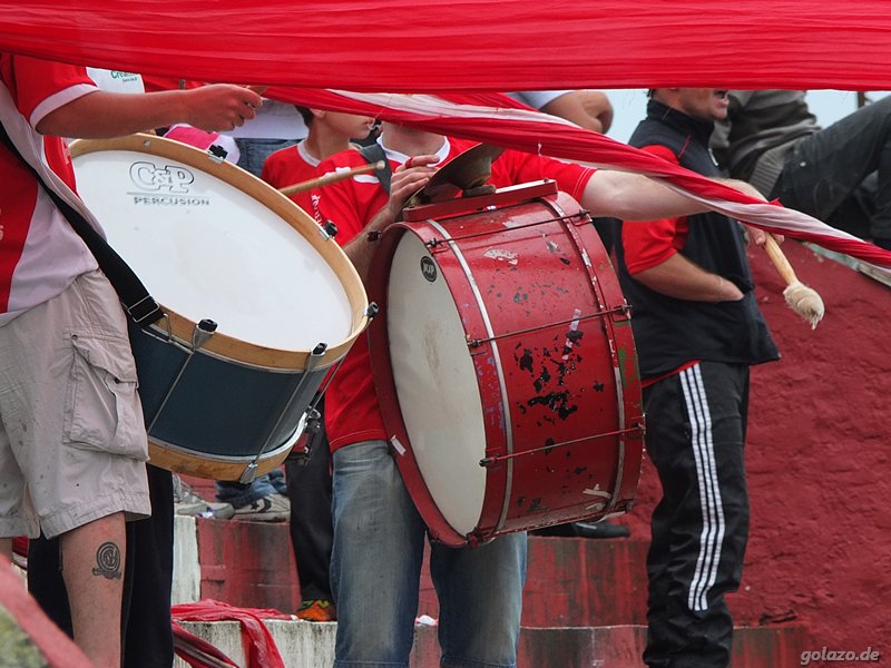 Die knapp 20-30 Mann der Heimbarra betraten das Stadion erst unmittelbar vor Anpfiff und nahm den Mittelbereich der Haupttribüne ein. Anders als die Gäste hatten sie ihre Instrumente dabei, wobei die Trompete des Öfteren kläglich daneben lag. Trotz des stimmungstötenden Regens, der nur in der zweiten Hälfte etwas nachließ, unterstützen sie ihr Team nach besten Kräften. Große Derby-Stimmung kam aber nur selten auf, auch wenn sich beide Fanlager die gesamte Halbzeitpause über in allen Varianten und möglichen Wortspielen aufs Heftigste bepöbelten.