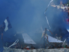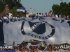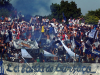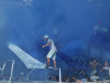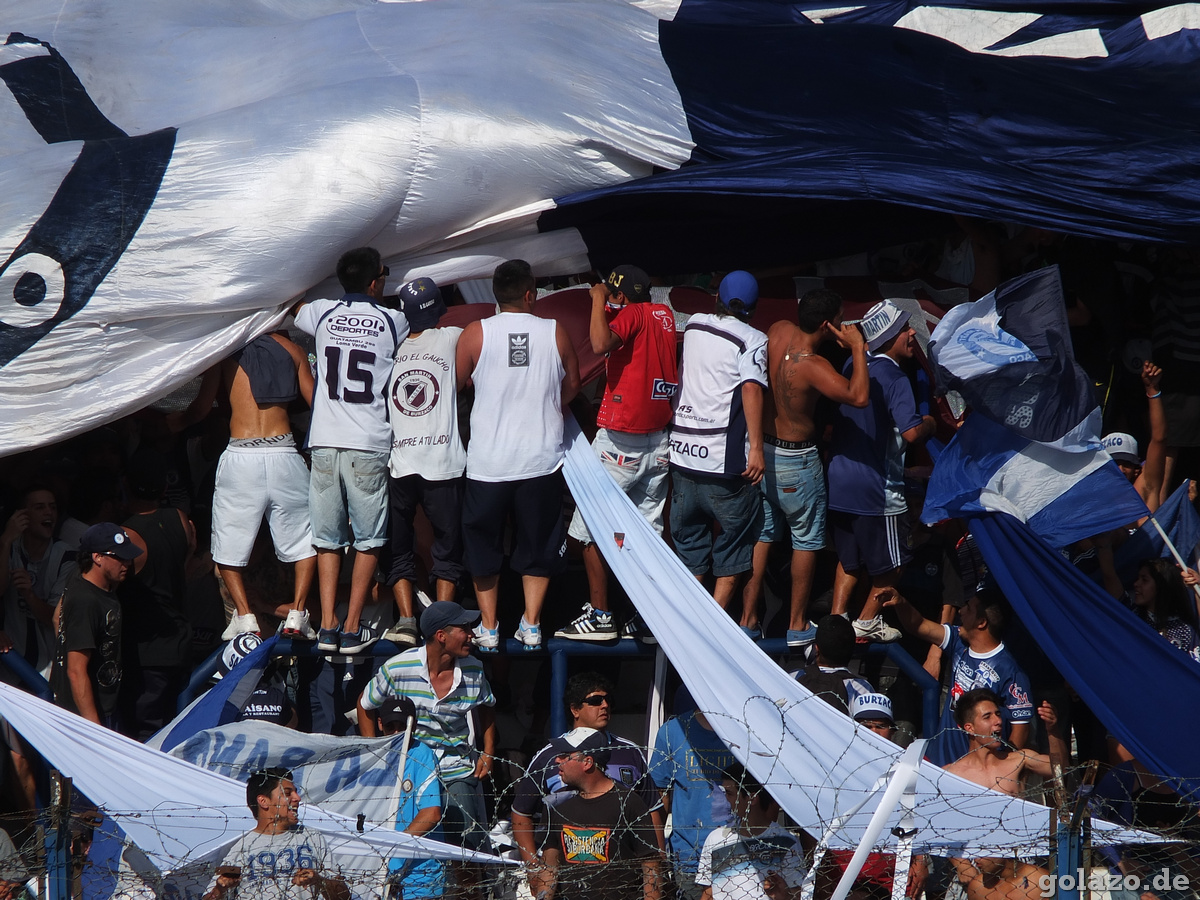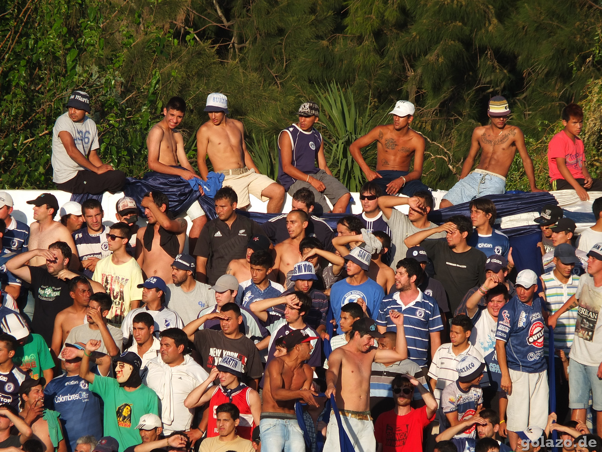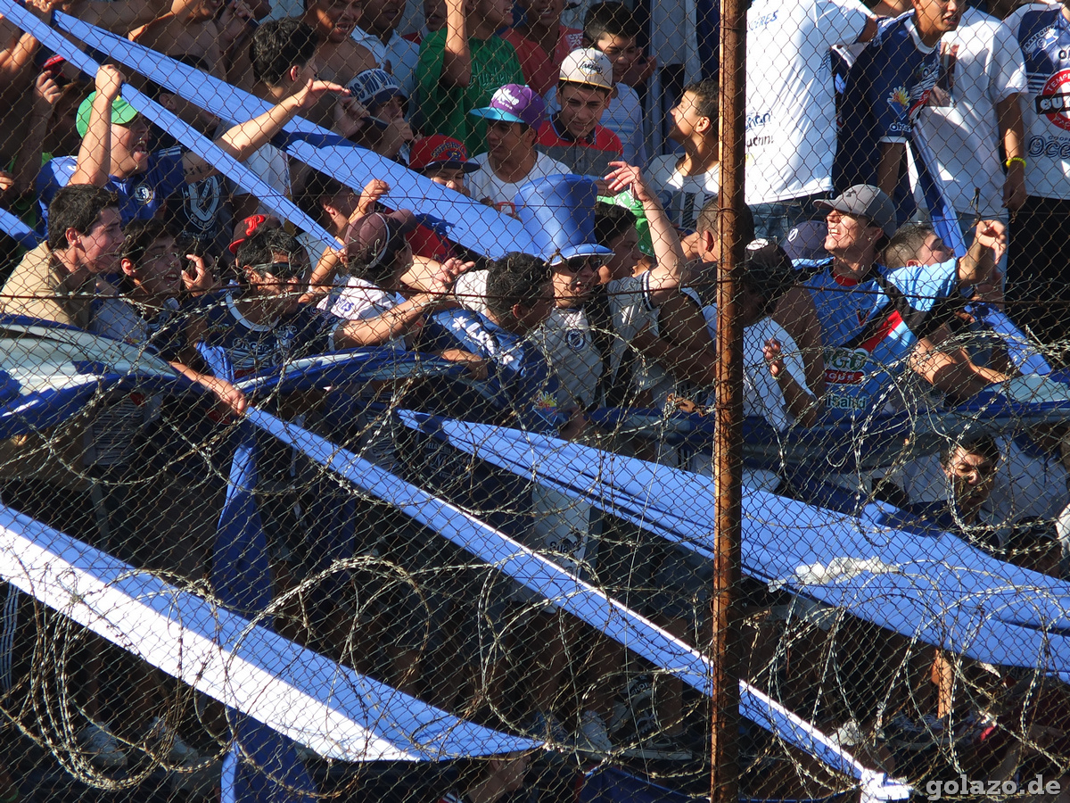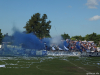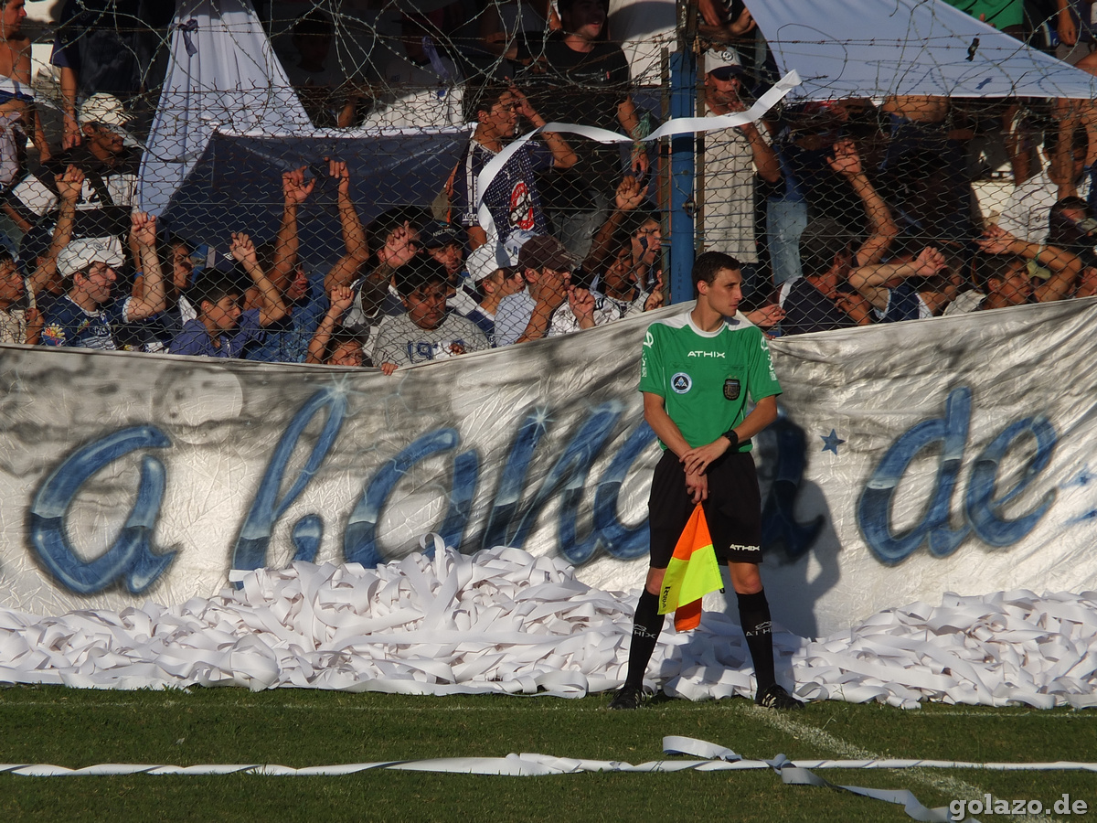 Schon vor dem Auflaufen der Mannschaften war es laut und es knisterte deutlich. Kurz vor 17:00 Uhr war es endlich soweit, die Teams kamen und die Spannung und Vorfreude entlud sich in einem Spektakel mit viel weiß-blauem Rauch, Papier, Blockfahnen und was so alles dazu gehört. Auch während des Spiels kam das genannte Folklorematerial öfter zum Einsatz. Dabei konkurrierten die zwei Barra-Fraktionen San Martins gegeneinander. Sowohl die auf der Hintertortribüne als auch die auf der Gegengerade hatten ihre eigenen Choreos und Gesänge, wobei sich mitunter gegenseitig provoziert wurde. Man mag sich halt nicht.