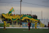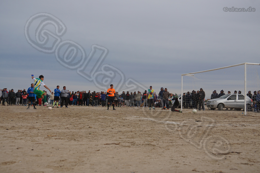 Die Sandplätze der unabhängigen Liga oder Liga barrial, also einer jener Ligen, die nicht direkt oder indirekt dem argentinischen Fußballverband AFA angebunden sind, liegen nur einen Steinwurf vom Tehuelche entfernt. Es war also naheliegend (lol), in der Halbzeitpause eine kleine Stippvisite zu unternehmen. In der Tat waren dort mehr Zuschauer anzutreffen als im Tehuelche, besonders bei einem leidenschaftlichen Halbfinale, das bis ins Elfmeterschießen ging. Das kuriose dabei, beide Teams hatten ähnliche Trikots mit den Farben grün-gelb so wie der Verein, von dem sie Fans waren: Defensores de La Ribera. Ansonsten sehr festliche Stimmung zu lauter Cumbia aus Boxen und der Grillwagen durfte Bier verkaufen, was bei offiziellen Ligen ja nicht der Fall ist. (Siehe dazu auch die Fotos.)